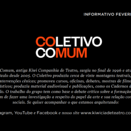 1 de setembro de 2017Reestreia do Fome.doc em outubro! 6 de setembro de 2017Reestreia de Manual de Autodefesa Intelectual no Espaço Cia da Revista! 24 de fevereiro de 2018Manual de autodefesa intelectual no 27º Festival de Teatro de Curitiba, 2018. 31 de maio de 2021Vulcões 28/05 15 de junho de 2021Vulcões 16/06 15 de junho de 2021Vulcões 18/06 24 de fevereiro de 2022COLETIVO COMUM 19 de maio de 2022[Post]Outros Trabalhos – Carne 24 de junho de 2022A exceção e a regra 24 de junho de 2022Herança Brecht 24 de junho de 2022Universidade e teatro 6 de dezembro de 2024Universo 6 de dezembro de 2024Os Números e a Vida 6 de dezembro de 2024eXílio